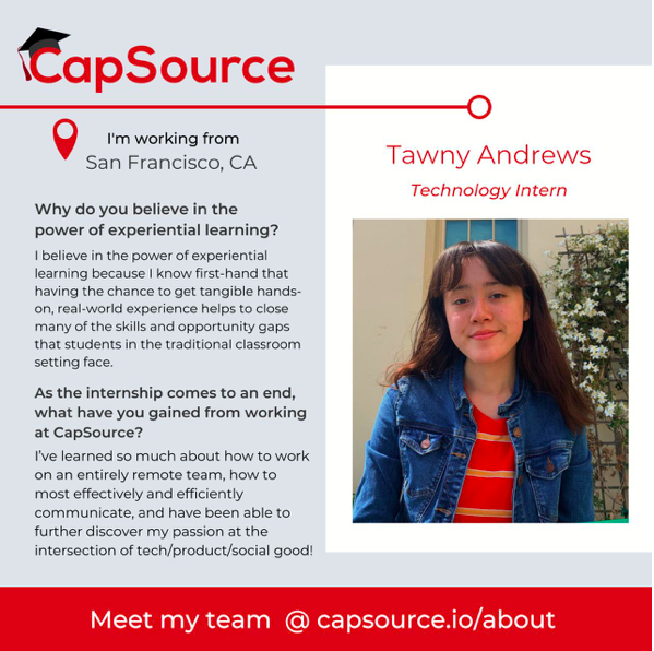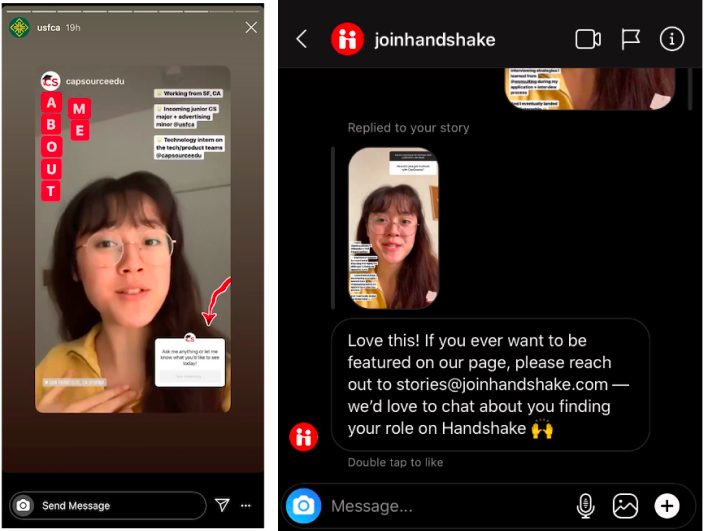 I was awarded "Intern of the Week" in July 2020, and took over the official CapSource Instagram account's stories to showcase "A Day in the Life of an Intern". My Instagram story posts boosted typical engagement on the account by 88%, garnering attention from the official Handshake company account, and was reposted by the official USFCA instagram account (with an audience of nearly 25,000 followers).