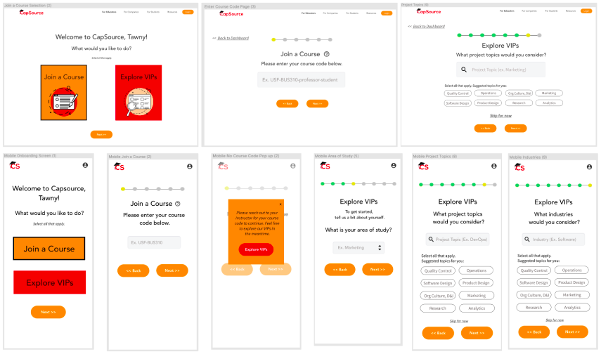 As a UX associate, I took on developing the initial wireframes for CapSource's new student onboarding experience to be utilized by educator clients. Using feedback and direction from existing and potential clients, I designed multiple iterations (low to high fidelity) of the student onboarding experience using Figma, and pitched my wireframes to the product + design teams. My designs were eventually adopted into CapSource's official student experience prototype, used during high profile pitches to universities. A preview of the desktop + mobile wireframes I pitched are shown below. You can view the full prototype here.