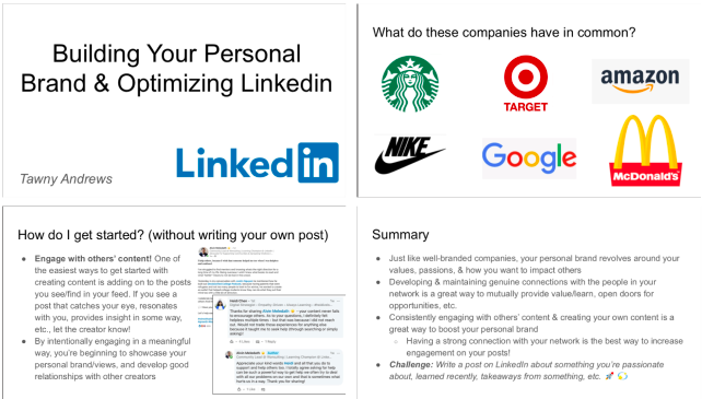 I hosted a workshop titled "Building Your Personal Brand & Optimizing Linkedin" as part of CapSource's biweekly personal & professional development sessions, dedicated to providing value for the entire team. During the workshop, I provided tips for determining one's personal brand, networking & content creation tips via Linkedin, and more. A preview of some of my presentation slides can be viewed below. You can view my full presentation deck here.