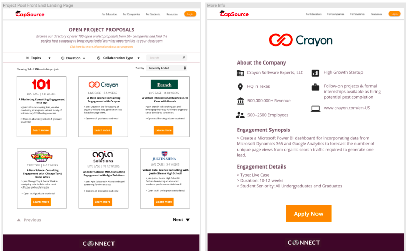 In my first intern project, I worked with two other interns to develop and pitch a new feature idea to the product + dev teams. The "Project Pool" feature sought to organize project listings for CapSource's 3 main users - students, educators, & companies - increasing efficiency by 70% compared to old project listings model. The final wireframe for the project pool home page + individual engagement info page used during our pitch was designed by me using Figma. Screenshots of my wireframe are listed below.