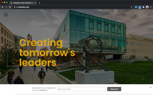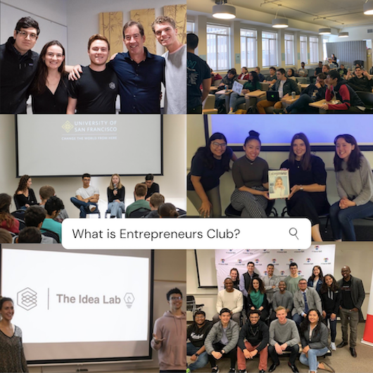 Entrepreneurs Club, also known as "E-Club", is University of San Francisco's exclusive student-led organization focused on all things tech, business, and entrepreneurship. The club seeks to bring together students across all years and majors to work on personal / professional development, skills building, networking, collaboration opportunities, and more, all while offering opportunities to directly immerse themselves in the entrepreneurial landscape of the Silicon Valley.