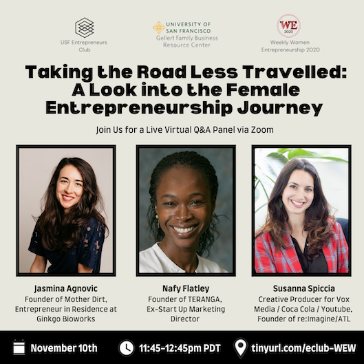 As part of EClub's now annual event partnership with Woman Entrepreneurs Week (rebranded at Weekly Women Entrepreneurs due to the onset of the COVID-19 pandemic) and the USFCA Gellert Family Business Center, I led coordination for this speaker panel event. My main roles included communicating with USFCA faculty and our panel of 3 speakers, marketing the event to the EClub/USFCA student community, and handling logistics for our first virtual speaker panel hosted + recorded via Zoom. A recording of the virtual event can be found below.